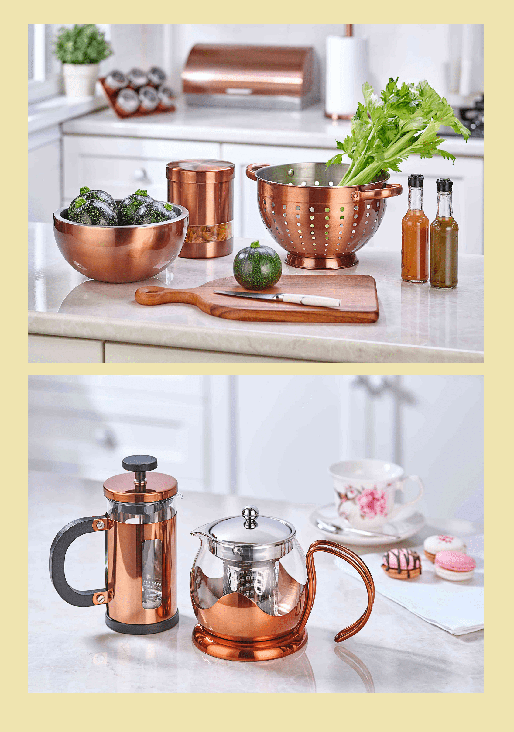 Bernardo’nun klasikleri arasına giren ekmek kutusu, bakır şıklığı ile kurgulanan Oldies serisi ile vintage bir hava kazandı. Mutfak tezgâhlarının vazgeçilmezleri arasında olan masa üstü aksesuarları, kağıt havluluk, baharatlık, annenizin yorgunluk kahvesi ve çayını hazırlayabileceği french press ve demlikler, Oldies serisinde şık yardımcılara dönüşüyor.