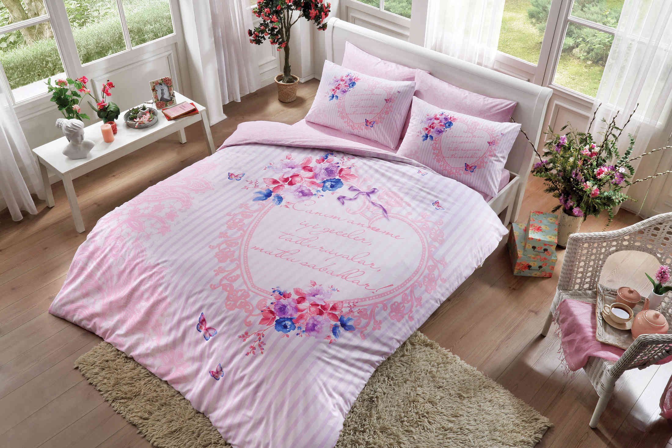 Pembe rengin hakimiyetindeki, çiçek, kelebek ve kalp desenli nevresim takımı “Canım anneme iyi geceler, tatlı rüyalar, mutlu sabahlar!” mesajıyla annenize olan sevginizi yansıtıyor.
